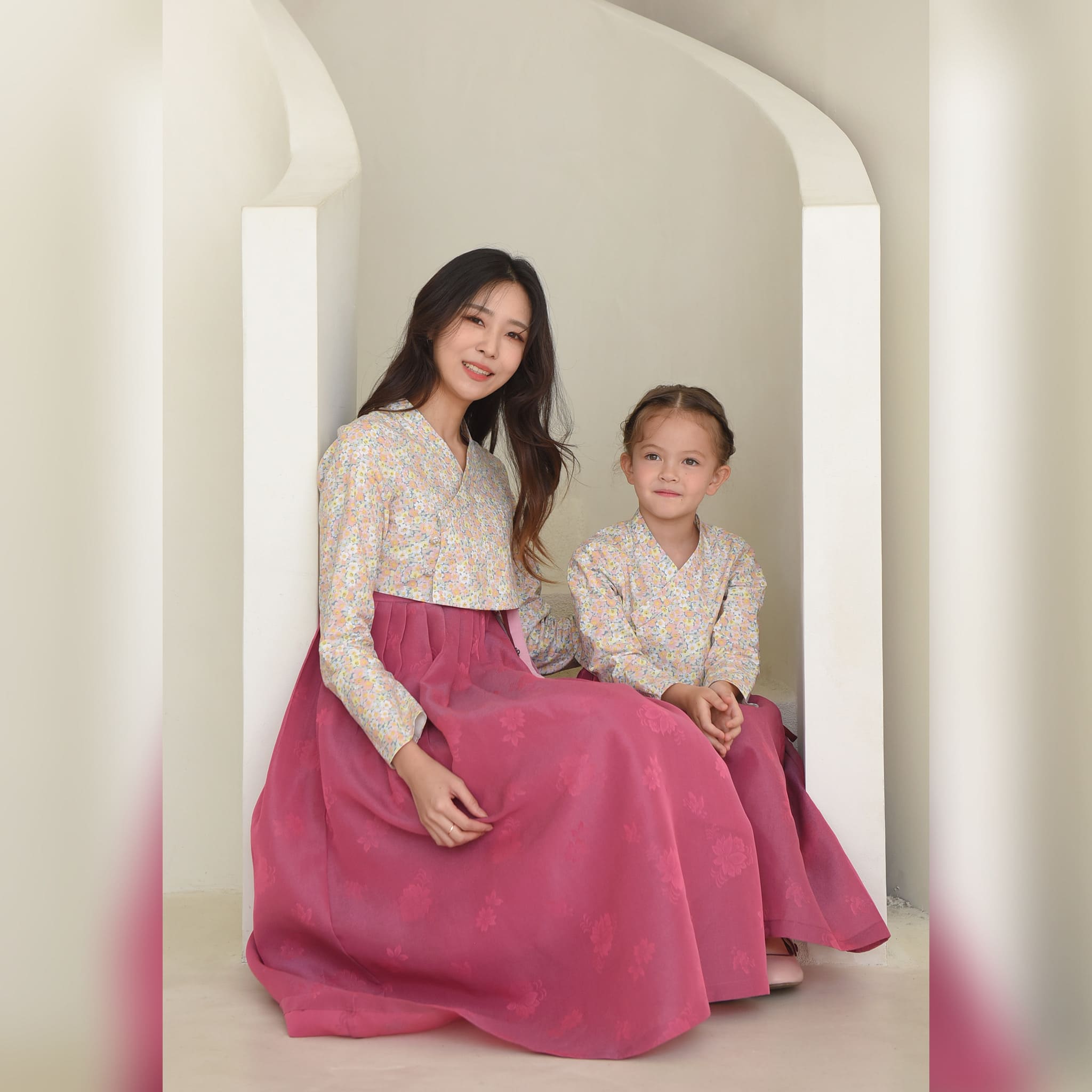 It is a jeogori with warm colors such as yellow, pink, and orange sunshine. Colors like the blue sky, which look pale on the ivory background, further harmonize the flowers.