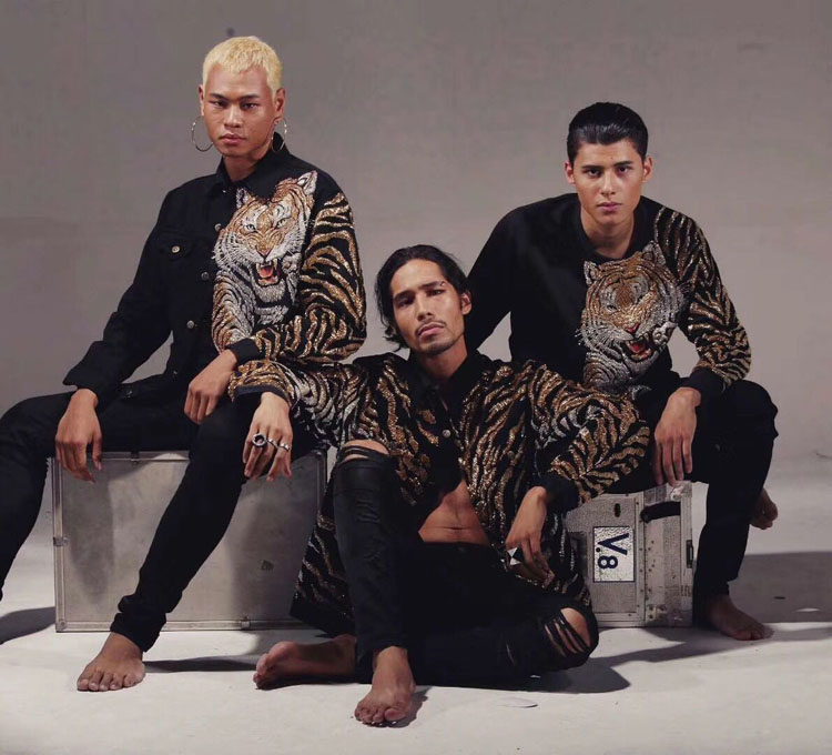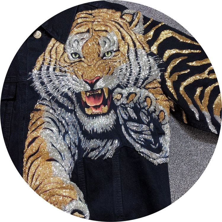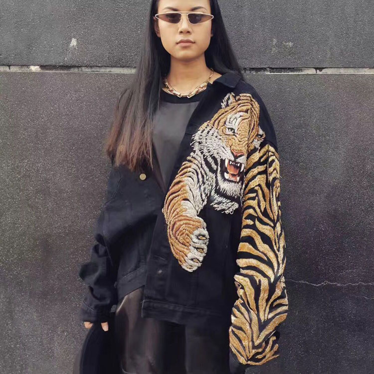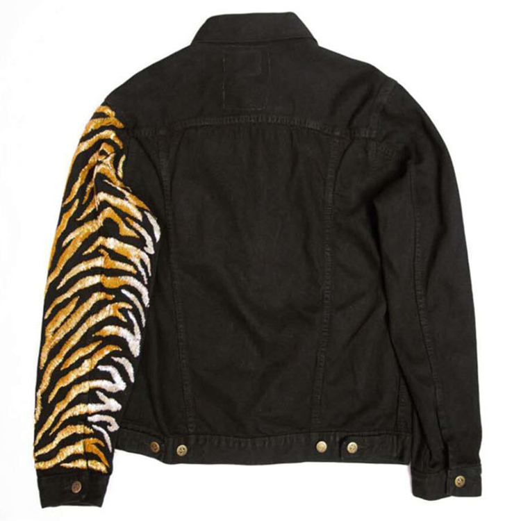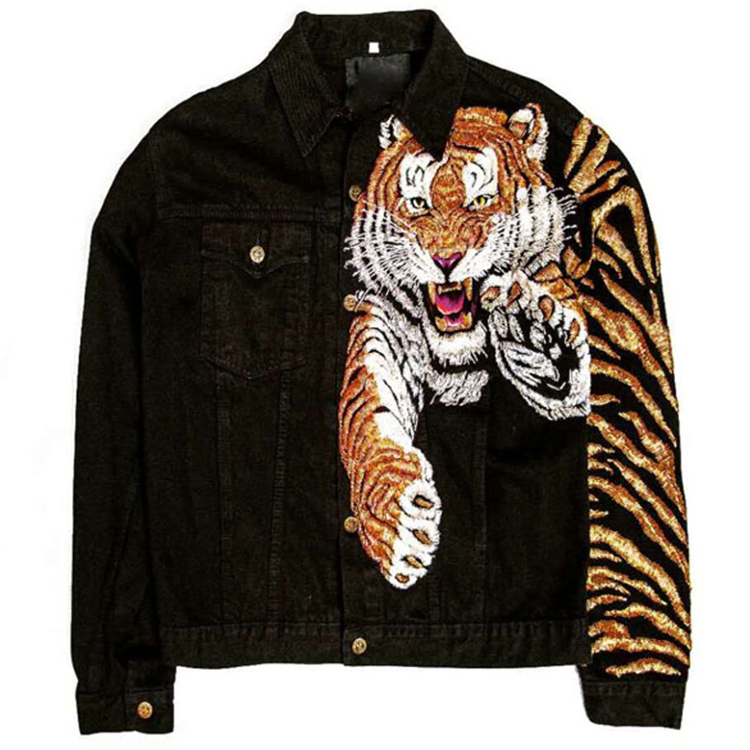 Custom high fashion mens black jean jacket tiger sequin embroidered luxury man jacket
