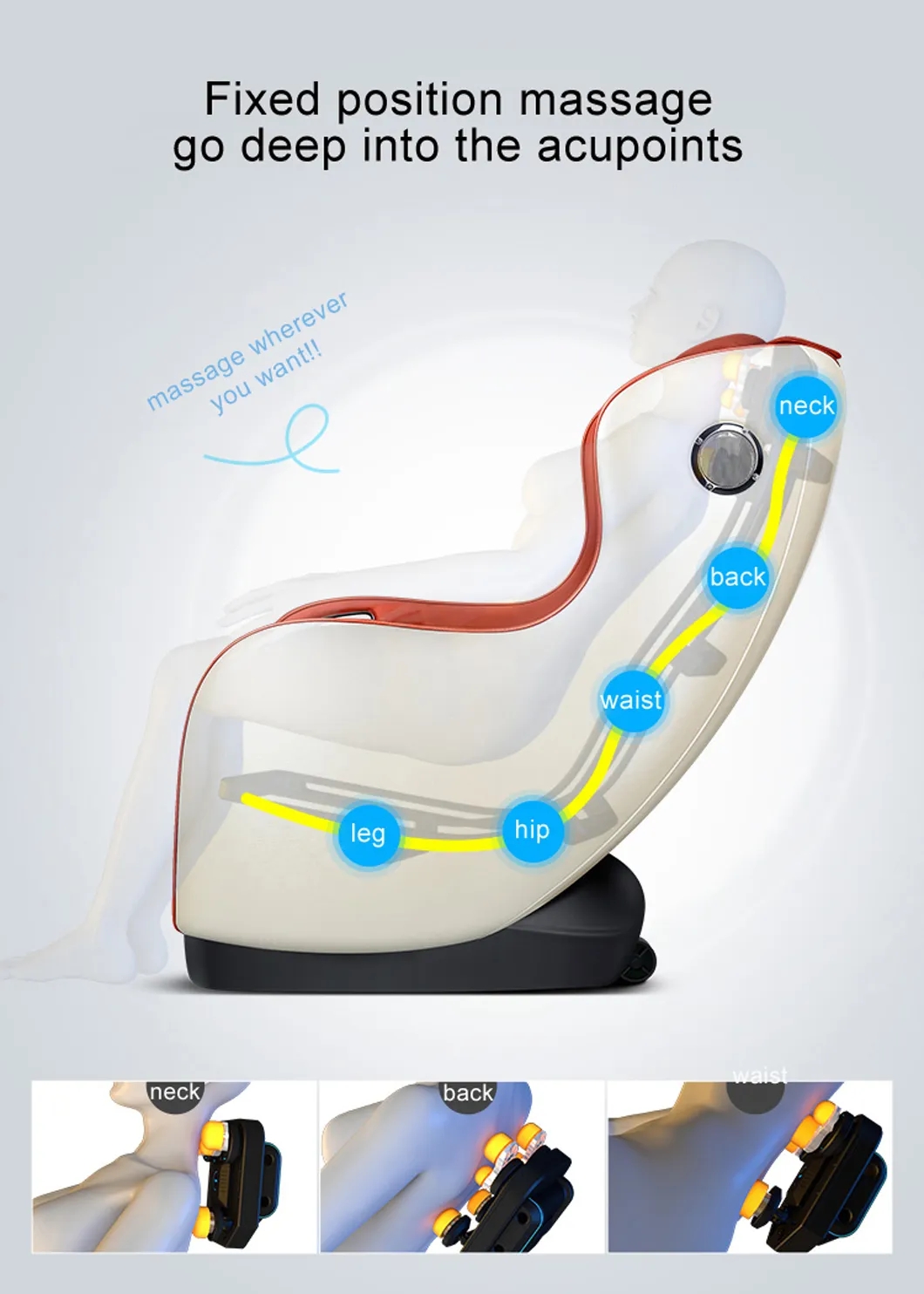 Description | 1.120CM SL ergonomic guide rail covers the whole massage from neck to buttocks. 2.The head and neck massage movement simulates the hand kneading of various acupoints on the head and neck. The waist and back kneading machine core kneading and beating simultaneously from the shoulder to the buttocks massage 2 sets of air pressure beautiful buttocks to shape, which greatly improves the body feeling and efficiency of the massage. 3.Wireless Bluetooth speakers on both sides of the head create surround music effects. 4.rated power 80W, voltage 12V |
