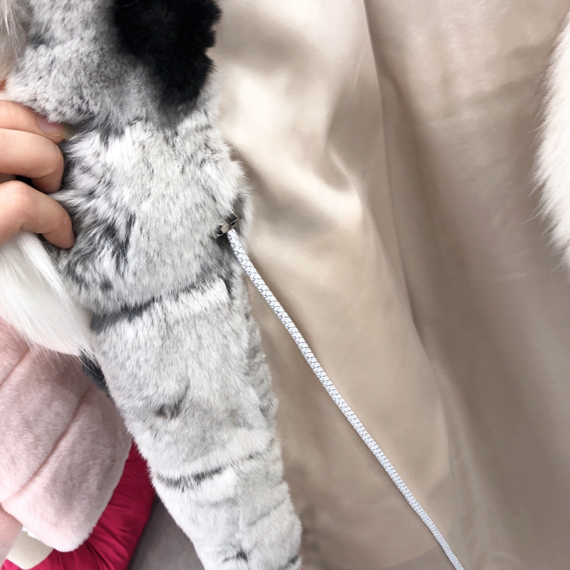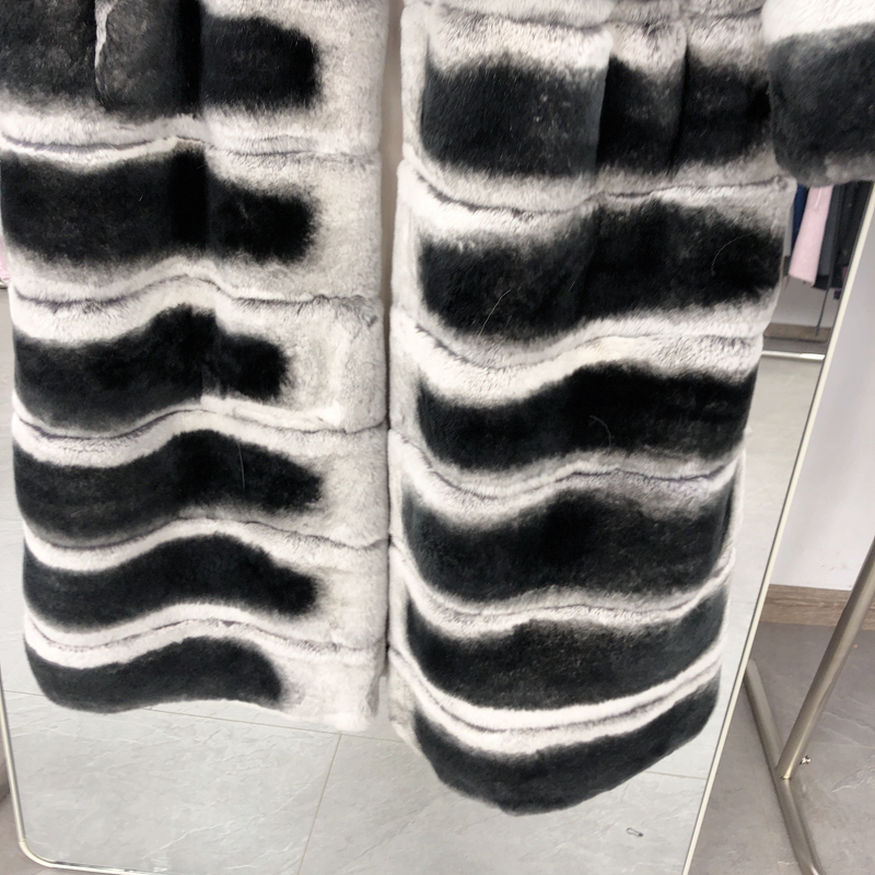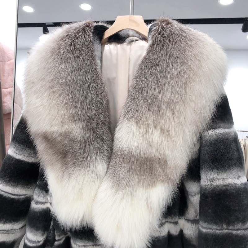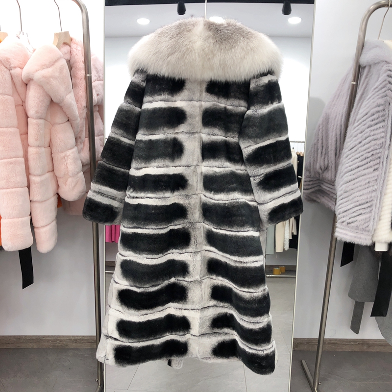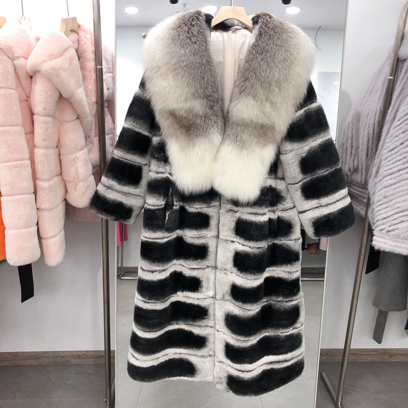 High Quality hot sale luxury winter women Genuine dyed chinchilla rex rabbit x-long fur coat with fox fur collar
