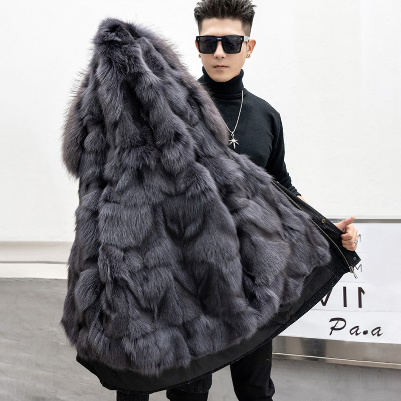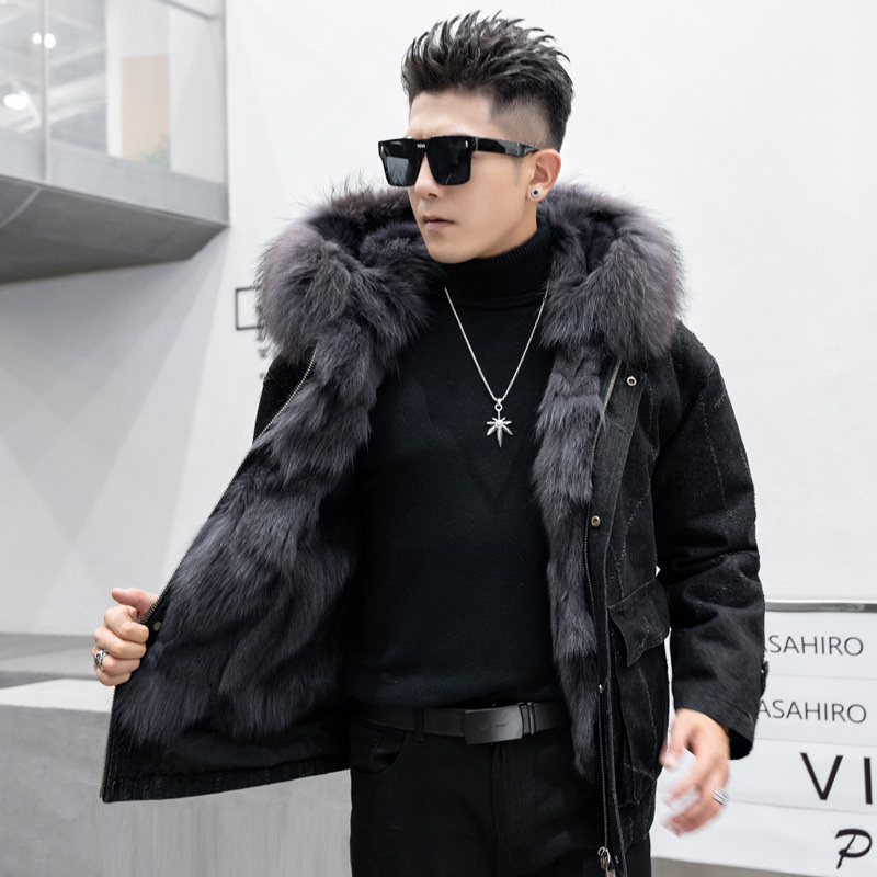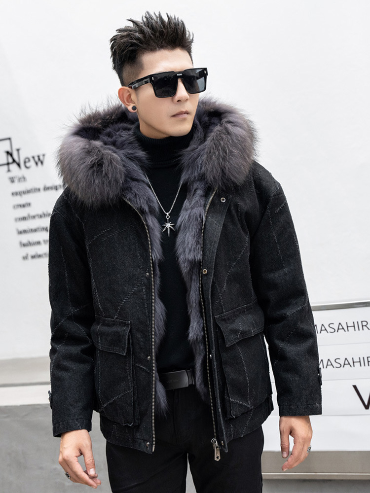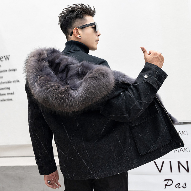 High Quality Winter Men Fox Fur Collar Denim Jacket Genuine Fur Jacket Men's Parka