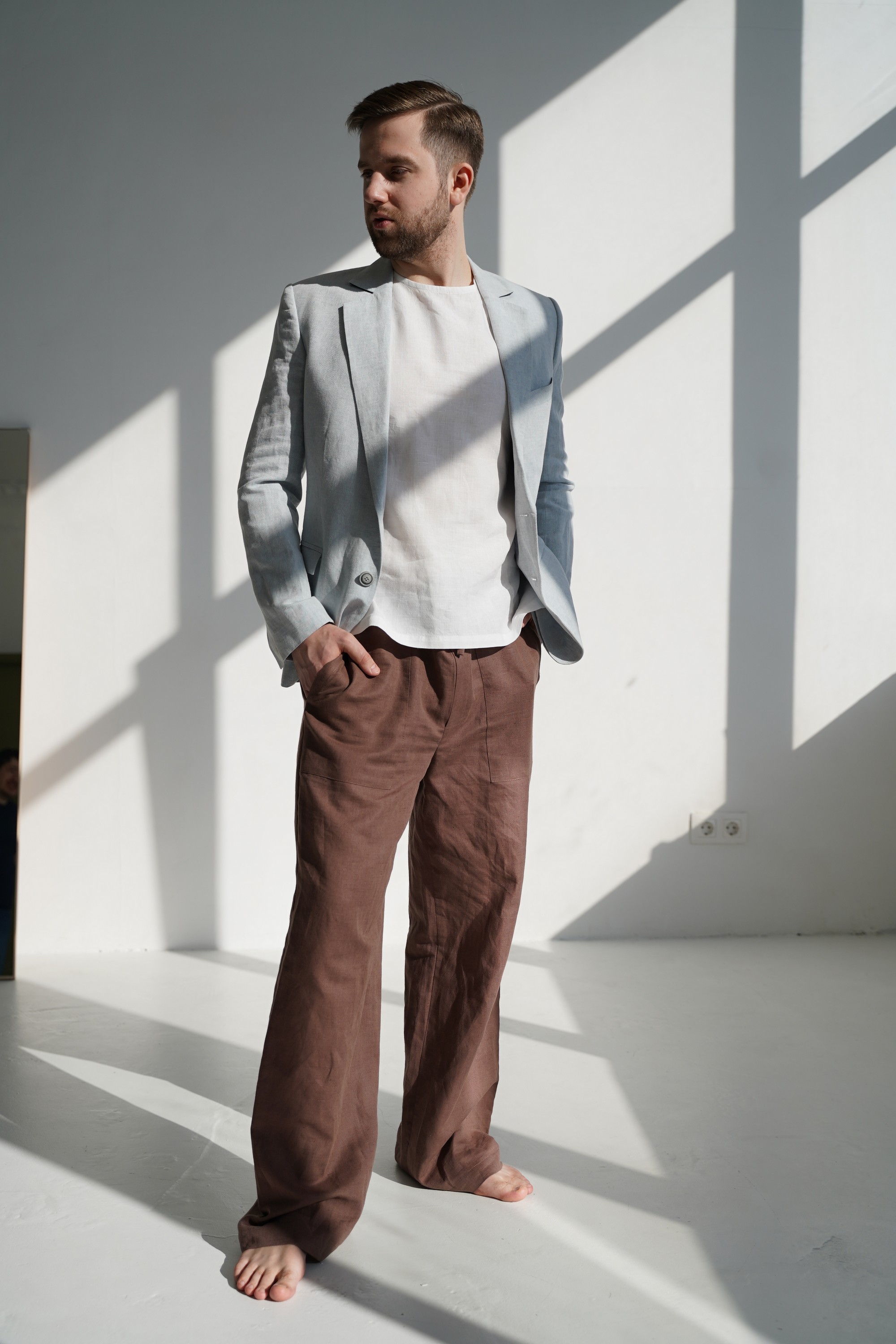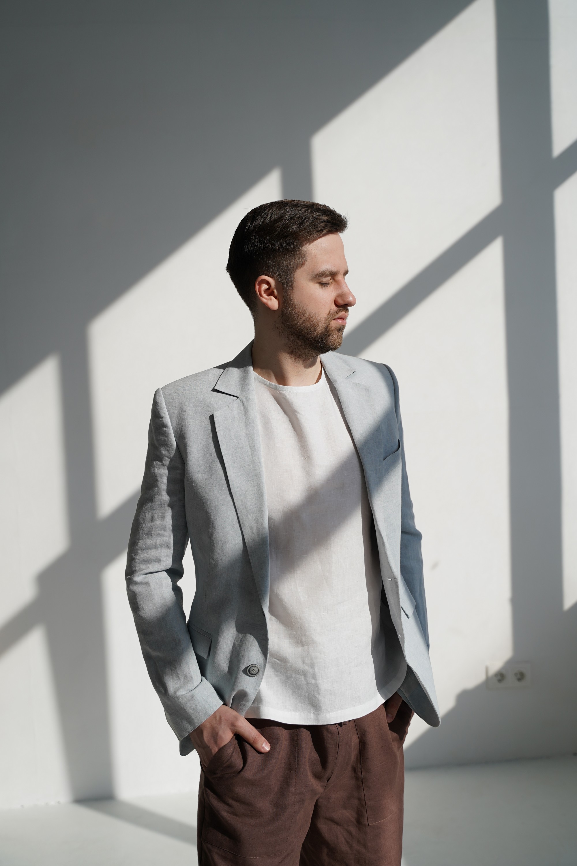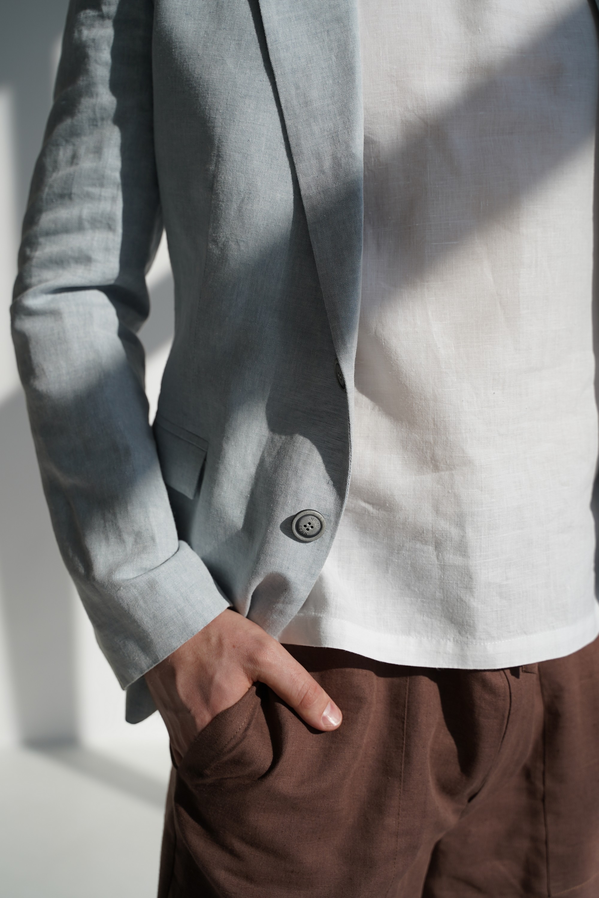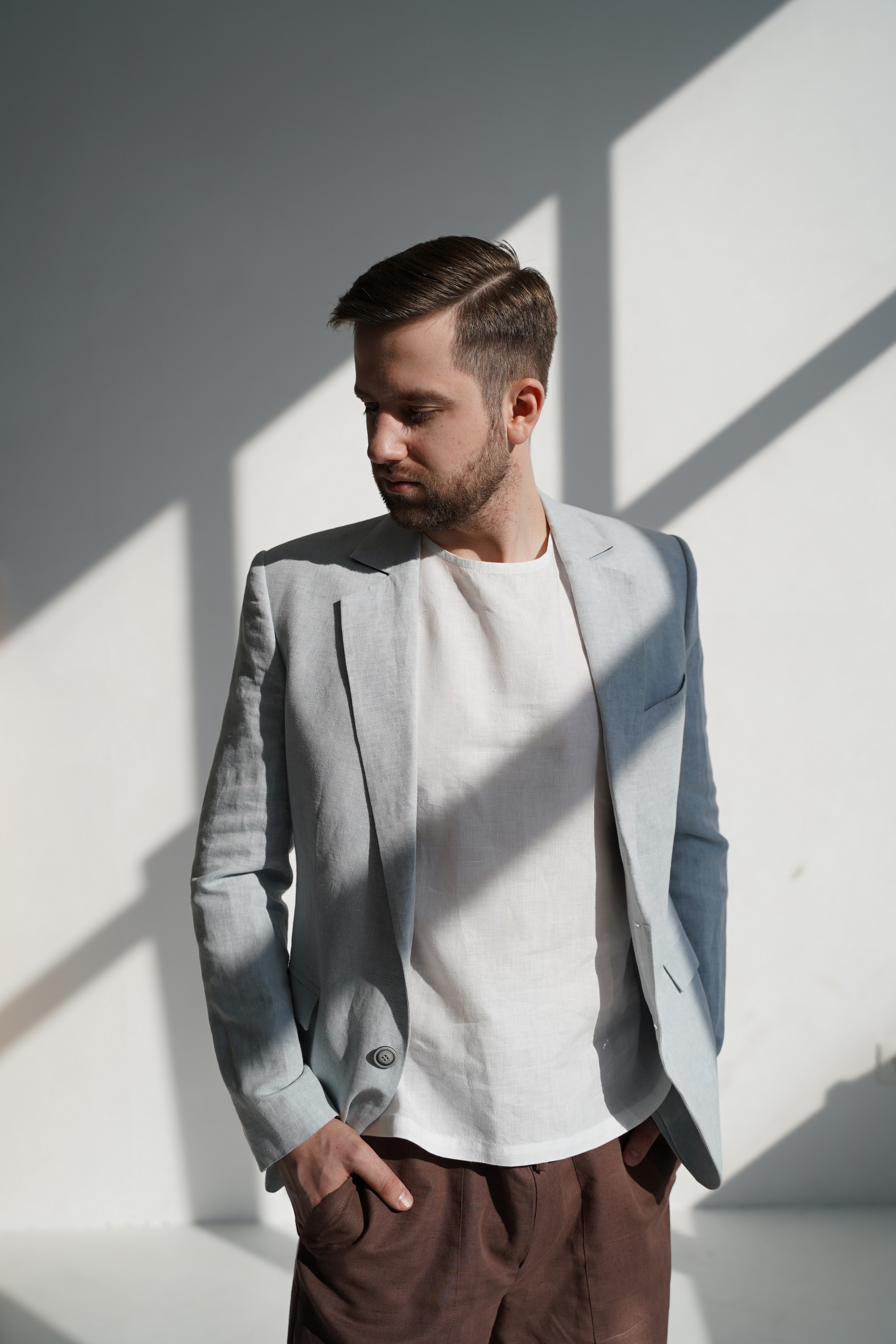 Men's slimline lined single-breasted jacket with 2 buttons featuring flap pockets, textured back seams with two vents for freedom of movement and notch lapel.