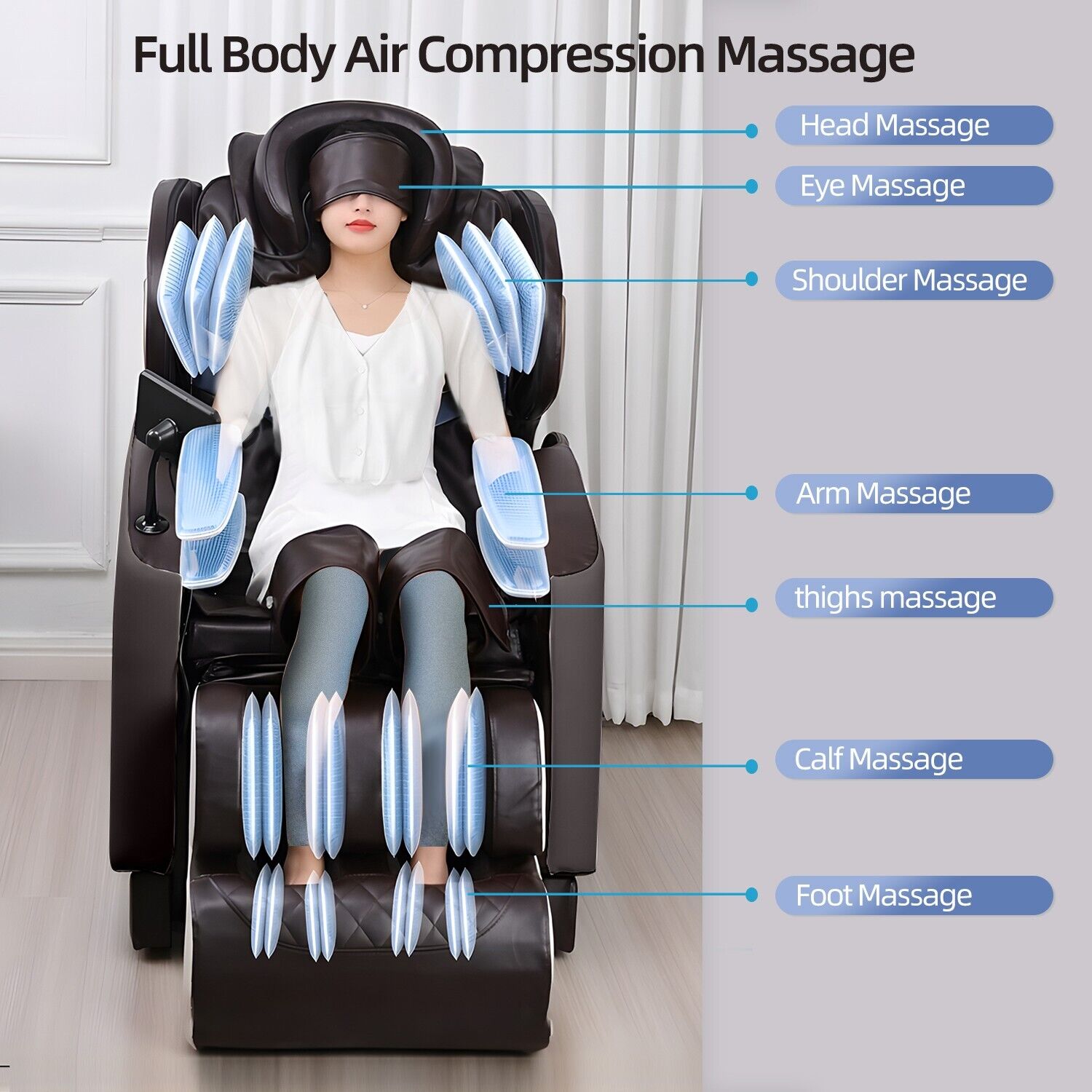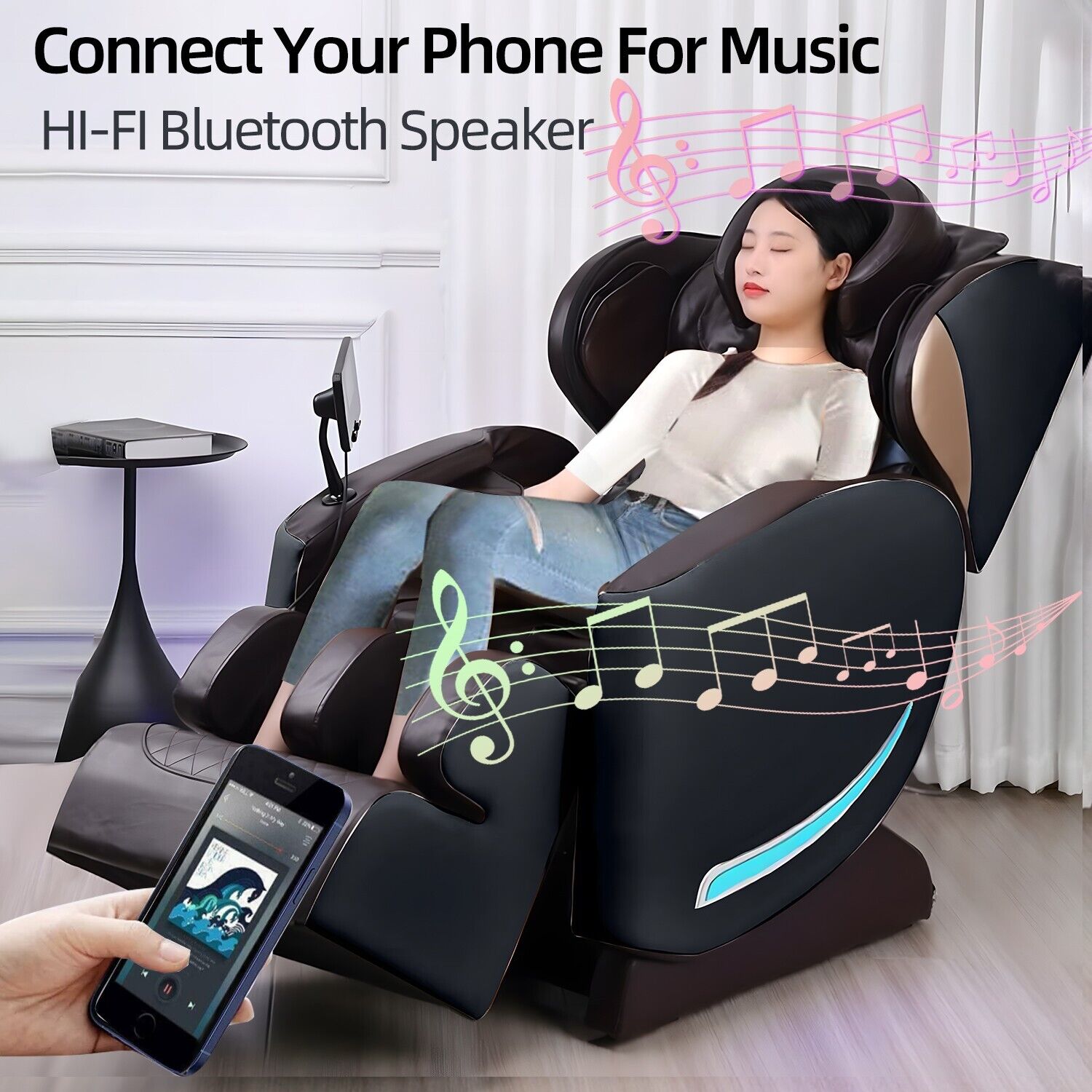 There are shitasu, airbag, kneading, rolling, heat and music(blue tooth) and zero-gravity functions,let you enjoy to all body relaxed massage;
