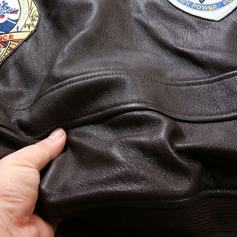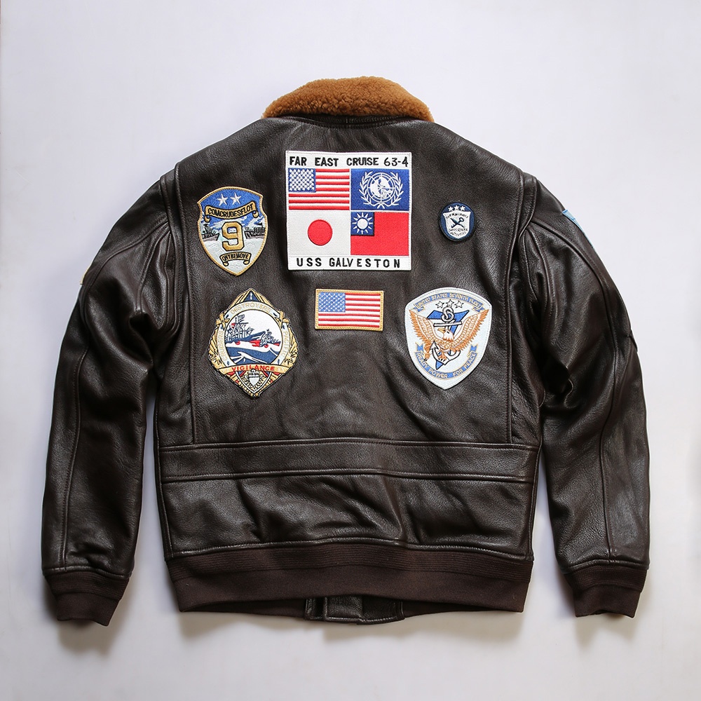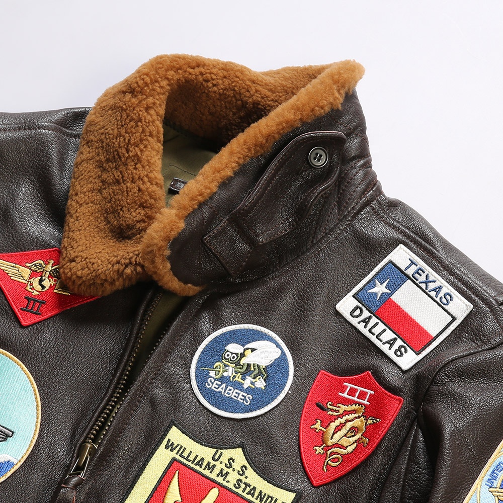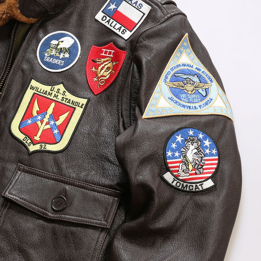 OEM Classic Custom High Quality Embroidery Top Gun Bomber Real Leather Jacket Motorcycle Fur Collar Vintage Men's Goat Skin Coat