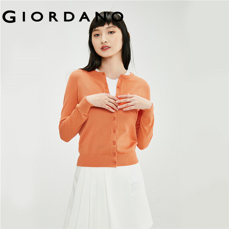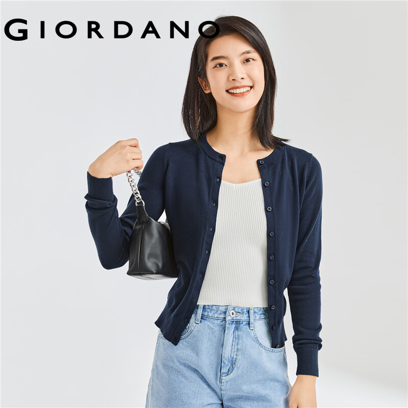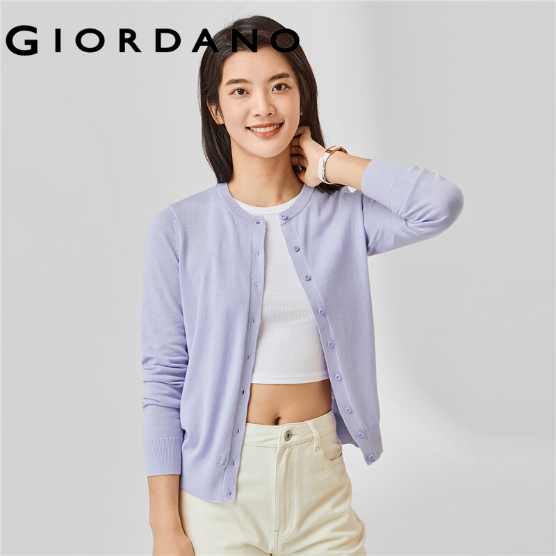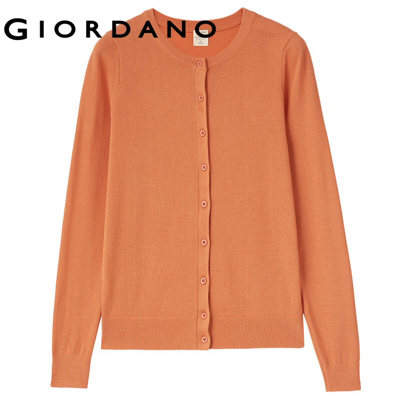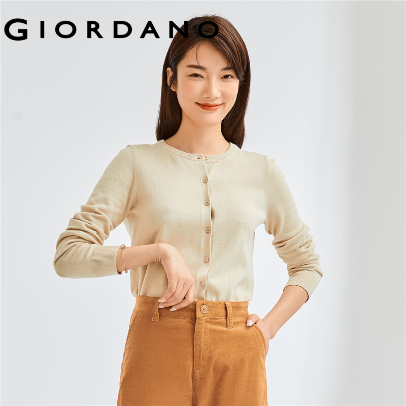 Giordano Women Cardigans Ribbed Cuffs Crewneck Cardigans Plain Button Closure 14-Needle Knitting Lightweight Cardigans 05351866