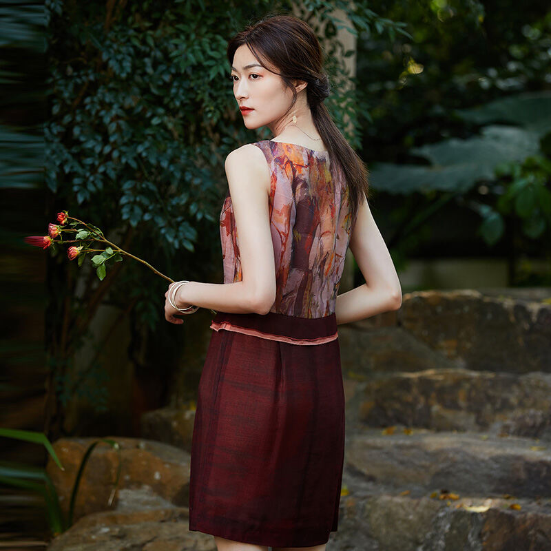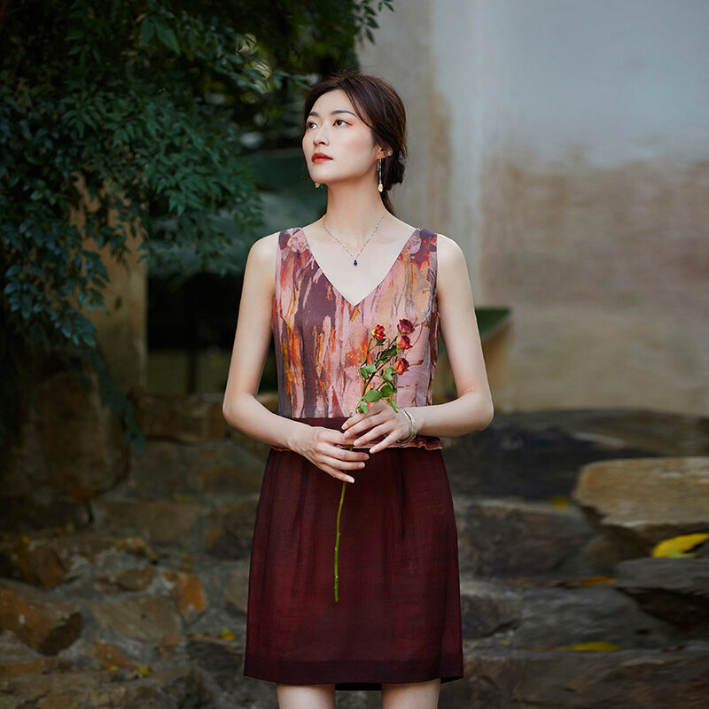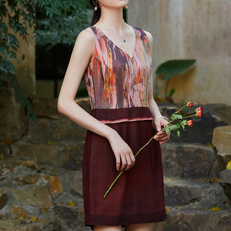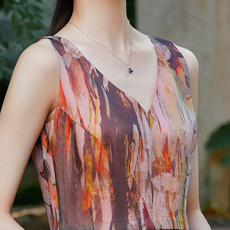 Tangy Summer Style Ethnic Style Original Design Silk V-neck Printed Sleeveless Stitching Dress