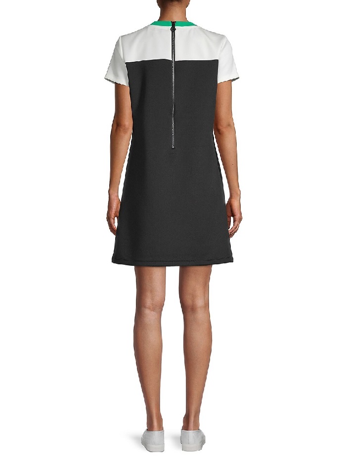 Sporty-chic dress styled with a kangaroo pocket and contrasting crewneck.