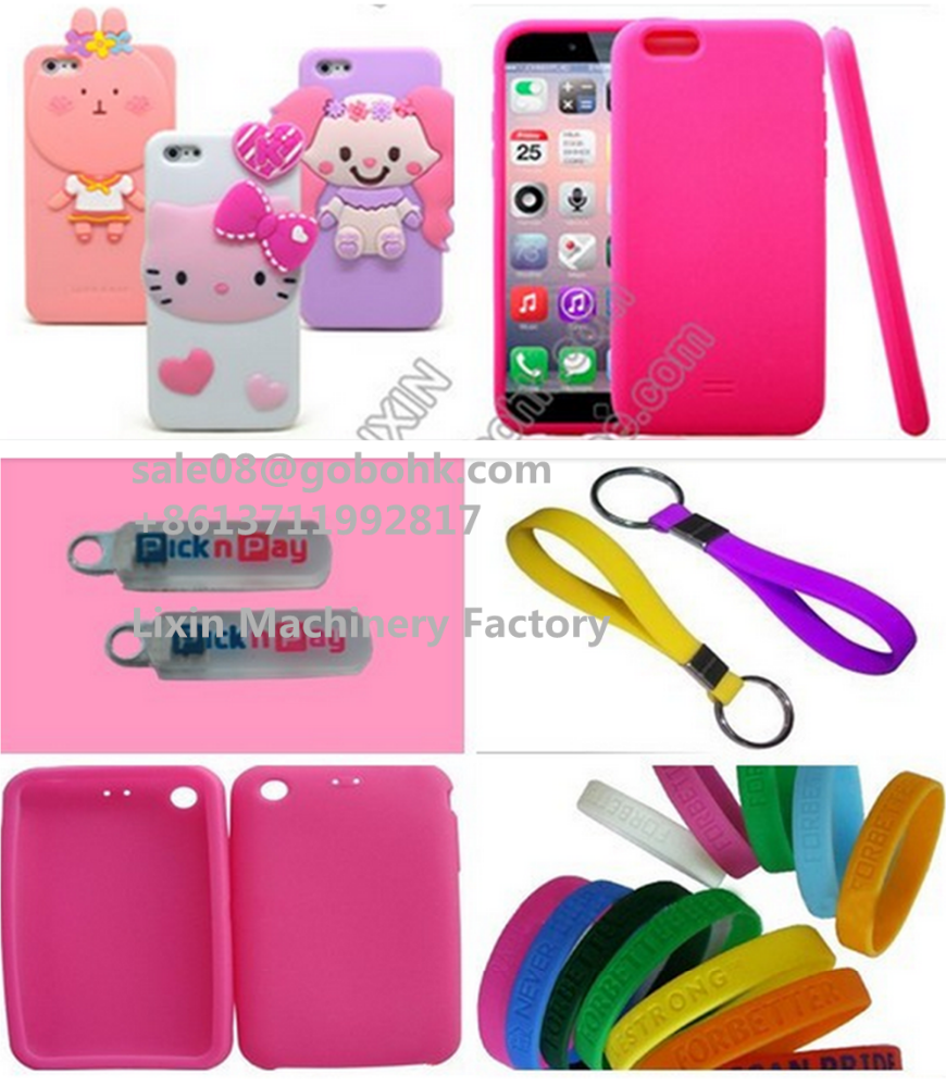 LX-S07 silicone mobile phone cover making machine can be applied to various kinds of silicone product manufacturing, such as keychain, portable wristband, bangle,silicone mobile phone cover, promotional gift, debossed or embossed bracelet, food mold, accessories, Remote controller button,mat and more.