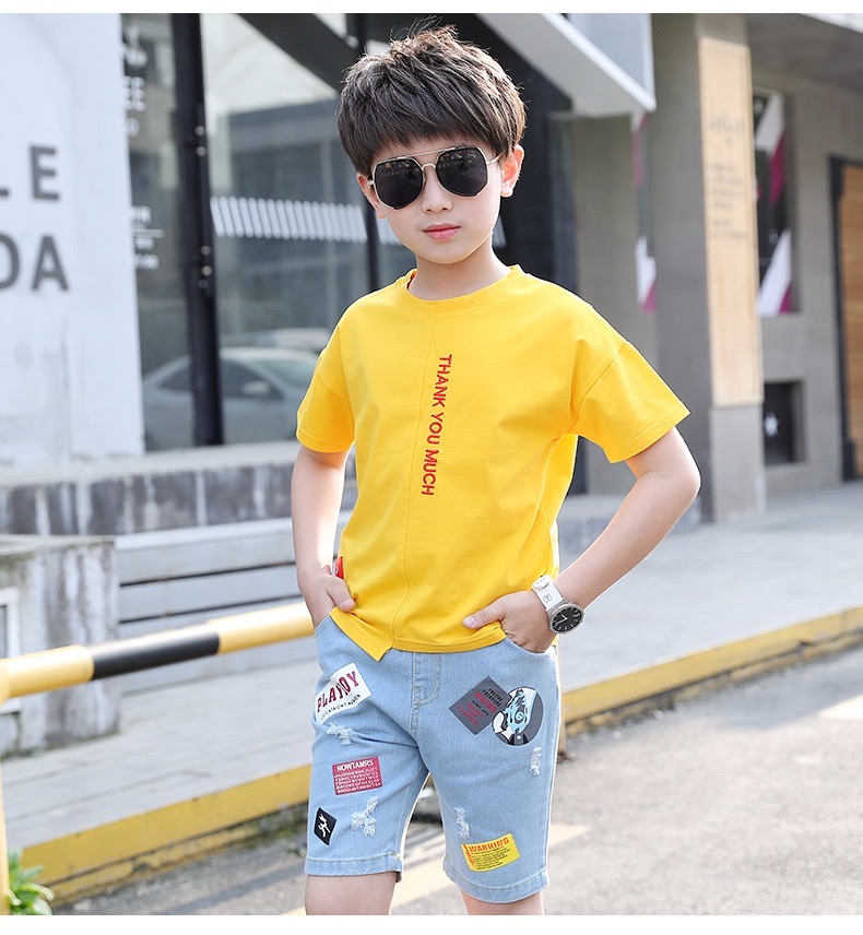 Children Short Sleeve Yellow Plain Outfits 2Pcs Sets Children Kids Cotton T-shirt Tops + Shorts Summer Casual Trendy Children's Clothes Set [US004]