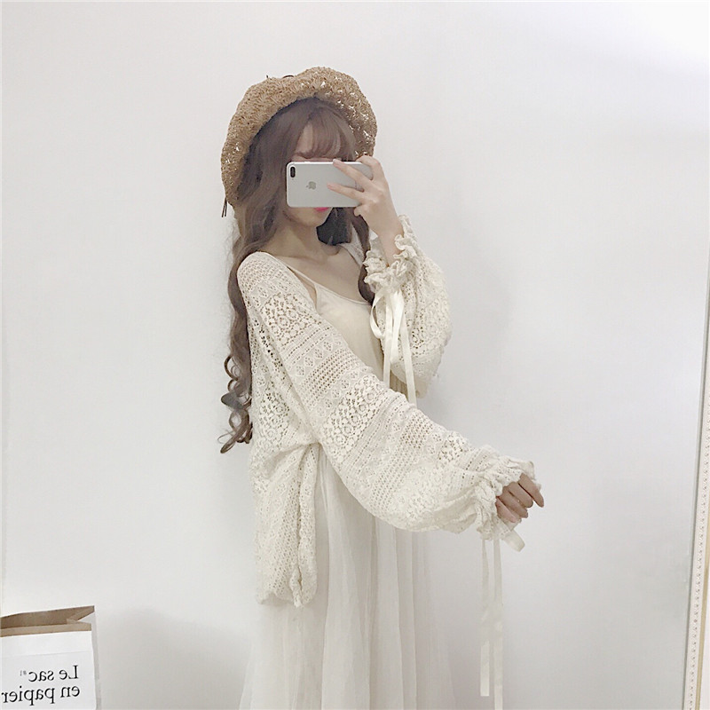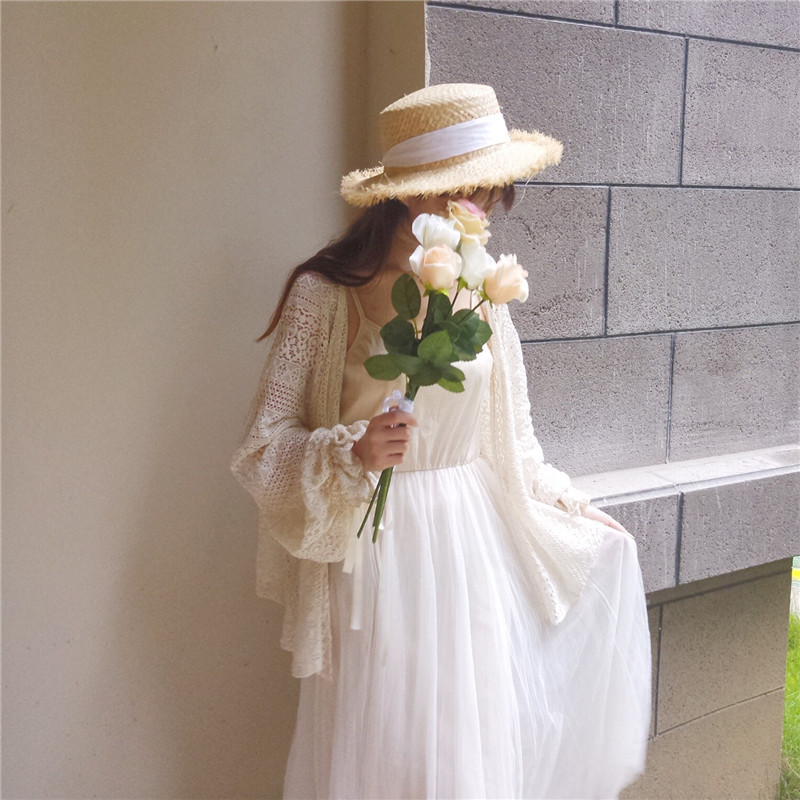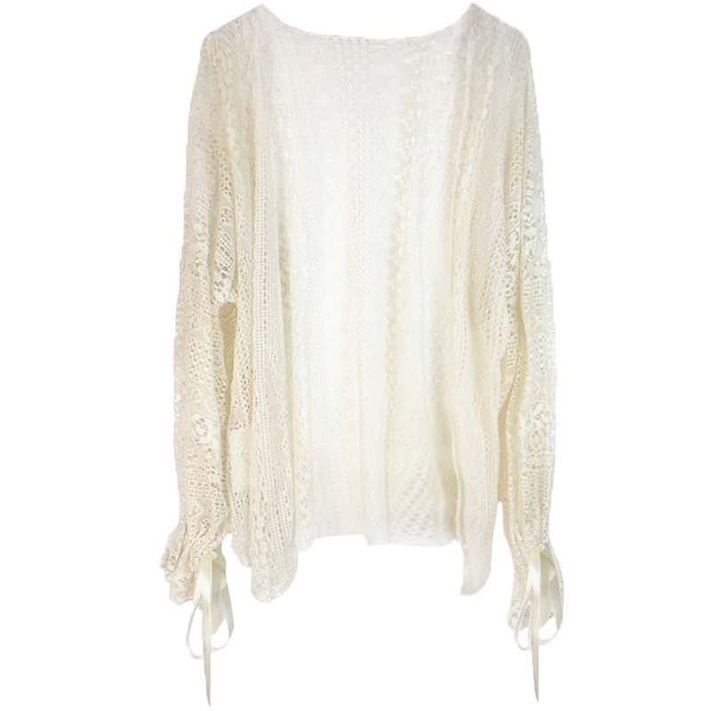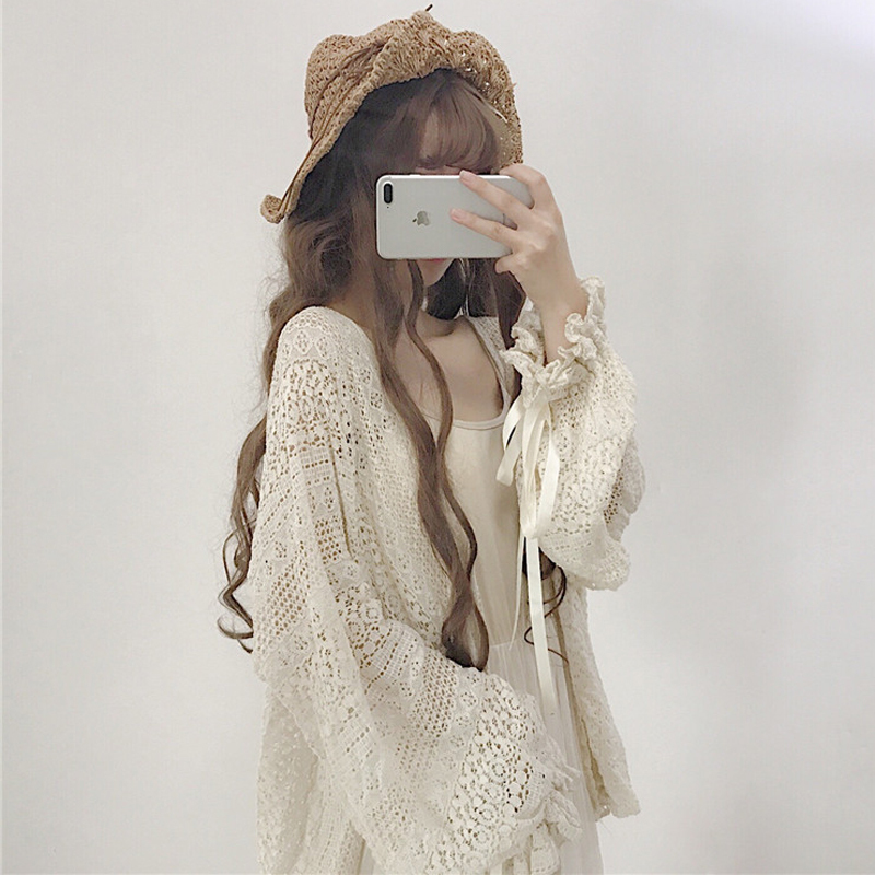 Crochet translucent lace beachwear bell sleeve blouse top sun block bikini cover up loose fit outerwear jacket pretty clothes BLS111